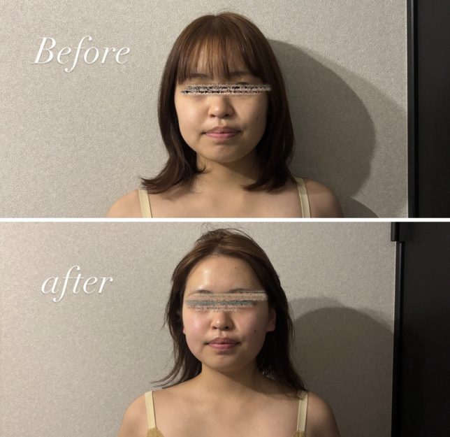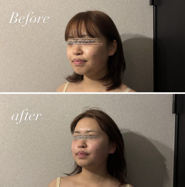 施術前はむくみが気になっていたお客様も、たった1回の施術でスッキリとしたフェイスラインに。写真だけでなく、鏡を見るたびに笑顔が増えるというお声もいただいています!